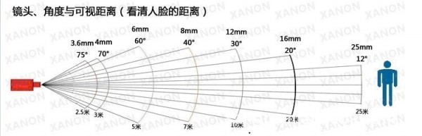 #6即F=6mm 拍攝距離為3~15米 拍攝角度為53°,#8即F=8mm 拍攝距離為4~20米 拍攝角度為40°,#12即F=12mm拍攝距離為5~25米 拍攝角度為25°,#16即F=16mm拍攝距離為5~30米 拍攝角度為20°#25:即F=25mm拍攝距離為20~80米拍攝角度為15°