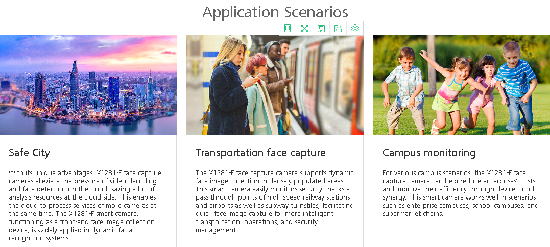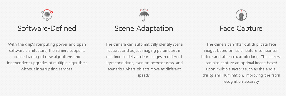 This smart camera with an 8-megapixel resolution for face checkpoint services, helps customers build a facial recognition system that is efficient, stable, and accurate. Based on computer vision, the camera integrates multiple technologies such as image processing, pattern recognition, and deep learning to analyze a large amount of video in real time and extract valuable key information from the video.