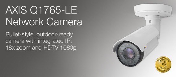 AXIS Q1765-LE Network Camera is a slim, bullet-style outdoor-ready network camera with 18x optical zoom and auto-focus. It delivers SMPTE-compliant HDTV 1080p video in multiple, individually configurable H.264 and Motion JPEG video streams. The built-in IR illumination is provided by four, auto adjusting LEDs that are highly power-efficient.