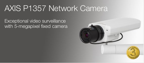 AXIS P1357 Network Camera enables coverage of a large area and extremely high image detail with 5-megapixel resolution or full frame rate HDTV 1080p in H.264 and Motion JPEG