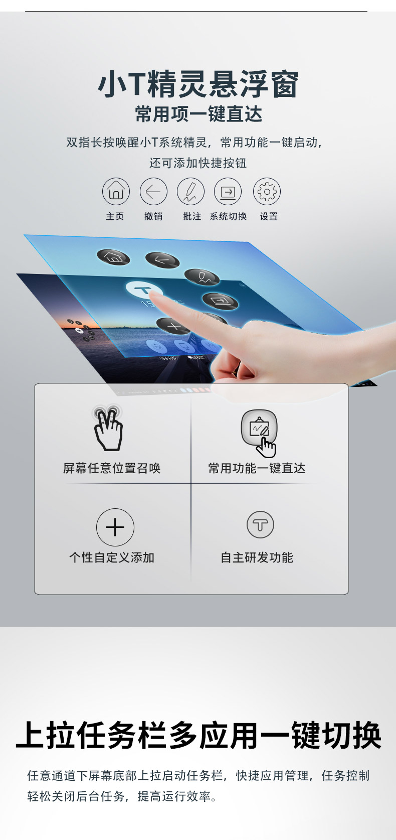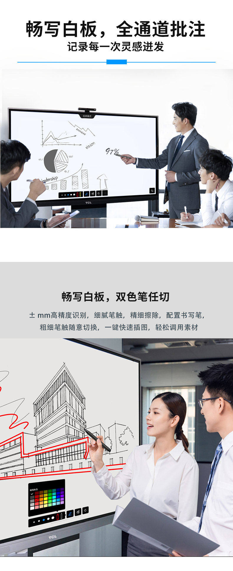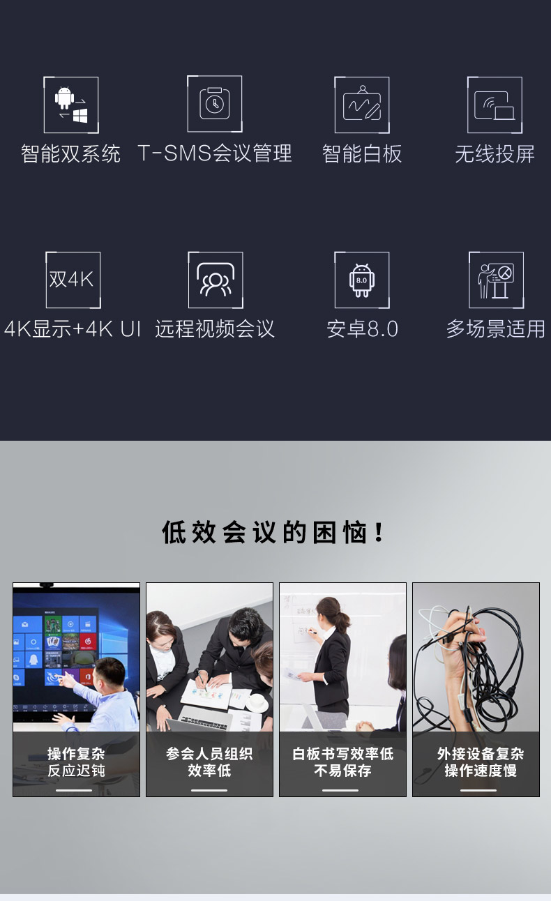 TCL V30系列智慧會(huì)議平板采用鋁合金超窄邊框設(shè)計(jì),纖薄機(jī)身,盡顯科技之美;智能雙系統(tǒng)設(shè)計(jì),讓操作更迅捷;常用功能一-鍵直達(dá),讓操作擁有行云流水般的暢快體驗(yàn); T-SMS會(huì)議管理系統(tǒng),讓會(huì)前、會(huì)中、會(huì)后任務(wù)輕松搞定,會(huì)議全程輕松駕馭。