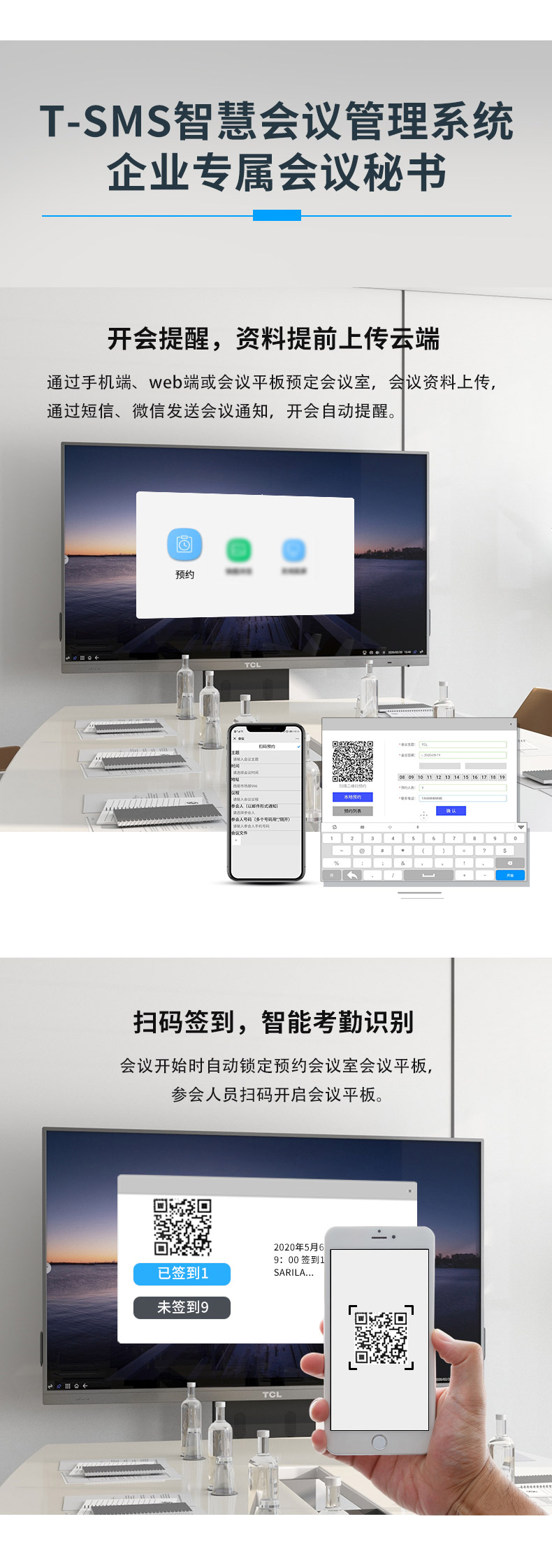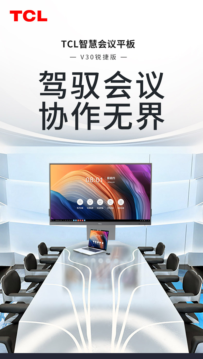 TCL V30系列智慧會(huì)議平板采用鋁合金超窄邊框設(shè)計(jì),纖薄機(jī)身,盡顯科技之美;智能雙系統(tǒng)設(shè)計(jì),讓操作更迅捷;常用功能一-鍵直達(dá),讓操作擁有行云流水般的暢快體驗(yàn); T-SMS會(huì)議管理系統(tǒng),讓會(huì)前、會(huì)中、會(huì)后任務(wù)輕松搞定,會(huì)議全程輕松駕馭。