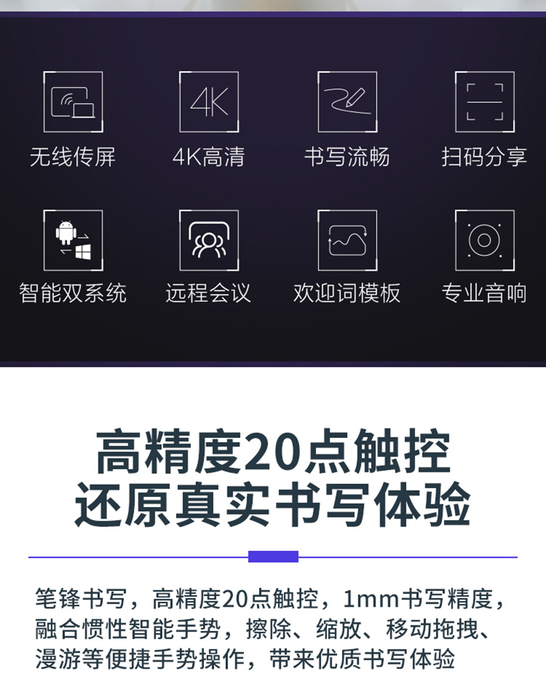 產品簡介:TCL L65V20P 智慧會議平板 TCL智能會議平板是全新一代的企業(yè)高效辦公設備,具有會議場景中需要的書寫、展示、協(xié)同三大功能,突破傳統(tǒng)會議的繁瑣束縛,輕松實現(xiàn)端與端之間的無線連接、人與人之間的跨時空連接,構筑簡潔高效的協(xié)作辦公體驗。 應用場
