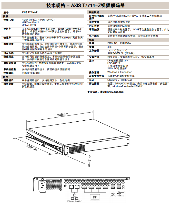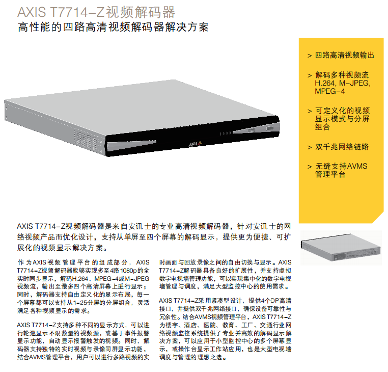 AXIS T7714-Z視頻解碼器是來自安訊士的專業(yè)高清視頻解碼器,針對安訊士的網(wǎng) 絡視頻產(chǎn)品而優(yōu)化設計,支持從單屏至四個屏幕的解碼顯示,提供更為便捷、可擴 展化的視頻顯示解決方案。 作 為 AXIS 視 頻 管 理 平 臺 的 組 成 部 分 , AXIS T7714-Z視頻解碼器能夠?qū)崿F(xiàn)多至4路1080p的全 實時同步顯示,解碼H.264、MPEG-4或M-JPEG 視頻流,輸出至最多四個高清屏幕上進行顯示; 同時,解碼器支持自由定義化的顯示布局,每一 個屏幕都可以支持從1-25分屏的分屏組合,靈活 滿足各種視頻顯示的需求。 AXIS T7714-Z支持多種不同的顯示方式,可以進 行輪巡顯示不限數(shù)量的視頻源,或基于事件報警 顯示功能,自動顯示報警觸發(fā)的視頻。同時,解 碼器支持獨特的實時視頻與錄像同屏顯示功能, 結合AVMS管理平臺,用戶可以進行多路視頻的實 時畫面與回放錄像之間的自由切換與顯示。AXIS T7714-Z解碼器具備良好的擴展性,并支持虛擬 數(shù)字電視墻管理功能,可以實現(xiàn)集中化的數(shù)字電視 墻管理與調(diào)度,滿足大型監(jiān)控中心的使用需求。 AXIS T7714-Z采用緊湊型設計,提供4個DP高清 接口,并提供雙千兆網(wǎng)絡接口,確保設備可靠性與 冗余性。結合AVMS視頻管理平臺,AXIS T7714-Z 為樓宇、酒店、醫(yī)院、教育、工廠、交通行業(yè)網(wǎng) 絡視頻監(jiān)控系統(tǒng)提供了專業(yè)并高效的解碼顯示解 決方案,可以應用于小型監(jiān)控中心的多個屏幕顯 示,或操作臺顯示工作站應用,也是大型電視墻 調(diào)度與管理的理想之選。