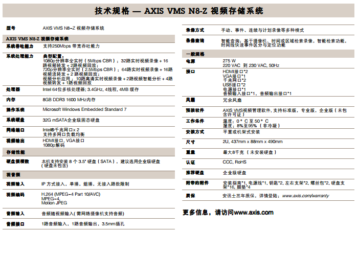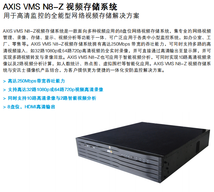 AXIS VMS N8-Z 視頻存儲(chǔ)系統(tǒng) 用于高清監(jiān)控的全能型網(wǎng)絡(luò)視頻存儲(chǔ)解決方案 AXIS VMS N8-Z視頻存儲(chǔ)系統(tǒng)是一款面向多種視頻應(yīng)用的8盤位網(wǎng)絡(luò)視頻存儲(chǔ)系統(tǒng),集專業(yè)的網(wǎng)絡(luò)視頻 管理、錄像、存儲(chǔ)、顯示、視頻分析等功能于一體,可廣泛應(yīng)用于各類中小型監(jiān)控系統(tǒng),如辦公室、工 廠、零售等。AXIS VMS N8-Z視頻存儲(chǔ)系統(tǒng)擁有高達(dá)250Mbps 帶寬的吞吐能力,可同時(shí)支持多路的高 清視頻接入,如32路1080p或64路720p高清視頻的全實(shí)時(shí)錄像,并可直接通過高清輸出至顯示屏,并可 實(shí)現(xiàn)多路視頻轉(zhuǎn)發(fā)與錄像回放。AXIS VMS N8-Z也可應(yīng)用于智能視頻分析,可同時(shí)實(shí)現(xiàn)10路高清視頻錄 像以及2路視頻分析計(jì)算,如人數(shù)統(tǒng)計(jì)、熱點(diǎn)圖、虛擬圍欄等智能化應(yīng)用。AXIS VMS N8-Z 視頻存儲(chǔ)系 統(tǒng)與安訊士攝像機(jī)產(chǎn)品結(jié)合,為客戶提供更為便捷的一體化安防監(jiān)控解決方案。 > 高達(dá)250Mbps 250Mbps 250Mbps帶寬吞吐能力 > 支持高達(dá)32路1080p或64路720p視頻高清錄像 > 同時(shí)支持10路高清錄像與2路智能視頻分析 > 8盤位,HDMI高清輸出